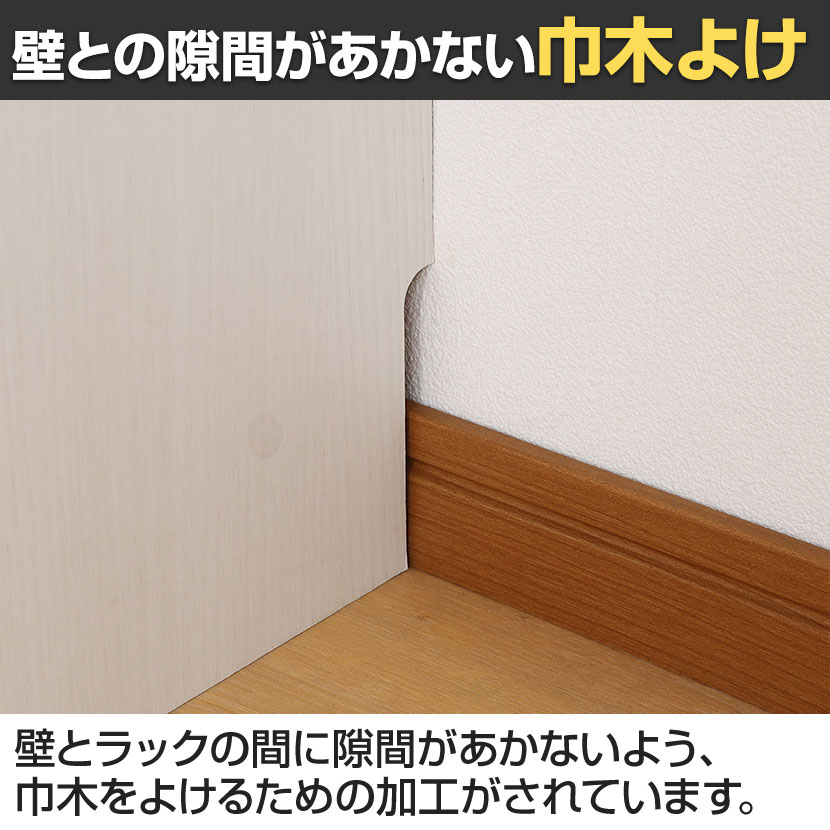 ・壁とラックの間に隙間があかないよう、巾木をよけるための加工がされています。
