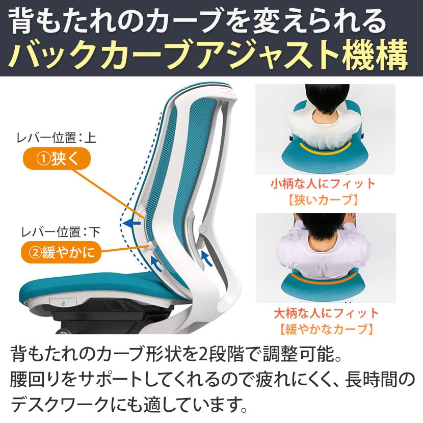 背もたれのカーブを2段階で調節可能