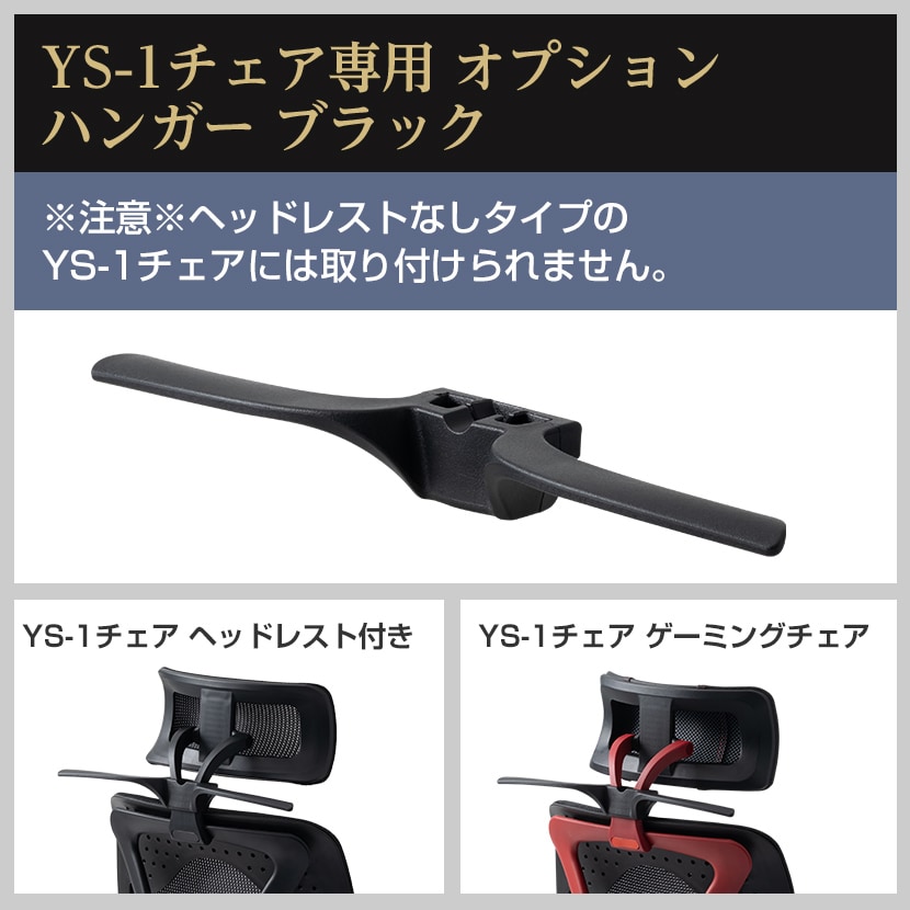 長時間のゲームやデスクワークの負担を、個々の体に合わせて軽減するオフィスチェアYS-1。そのブラックフレームタイプと組み合わせて使用できるオプションハンガーです。ジャケットやスーツの上着などをサッとかけることができ、衣類のシワ防止にも役立ちます。自由に取り外しでき、YS-1ゲーミングタイプにも取り付け可能です。(※ヘッドレストなしタイプのYS-1チェアには取り付けられません。)