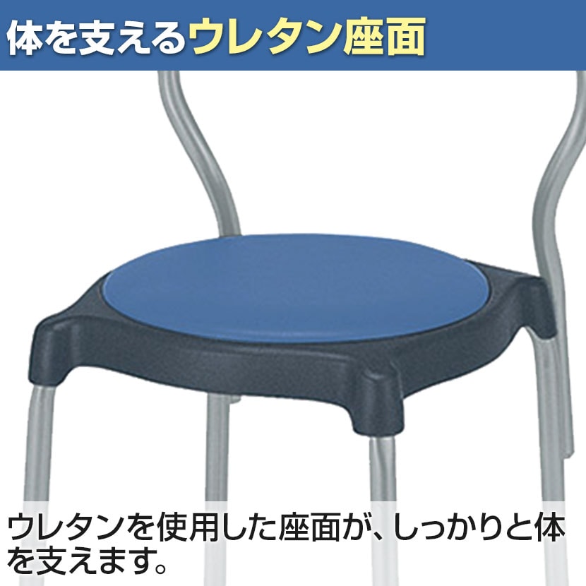 シンプルデザインのビニールレザー張り丸椅子です。脚先の滑り止めキャップ付きはシートカラーと合わせた配色で、機能性に加えてデザインのアクセントとなり、空間にポップな彩りをもたらします。収納時は4脚までスタッキングでき、省スペースに収まります。