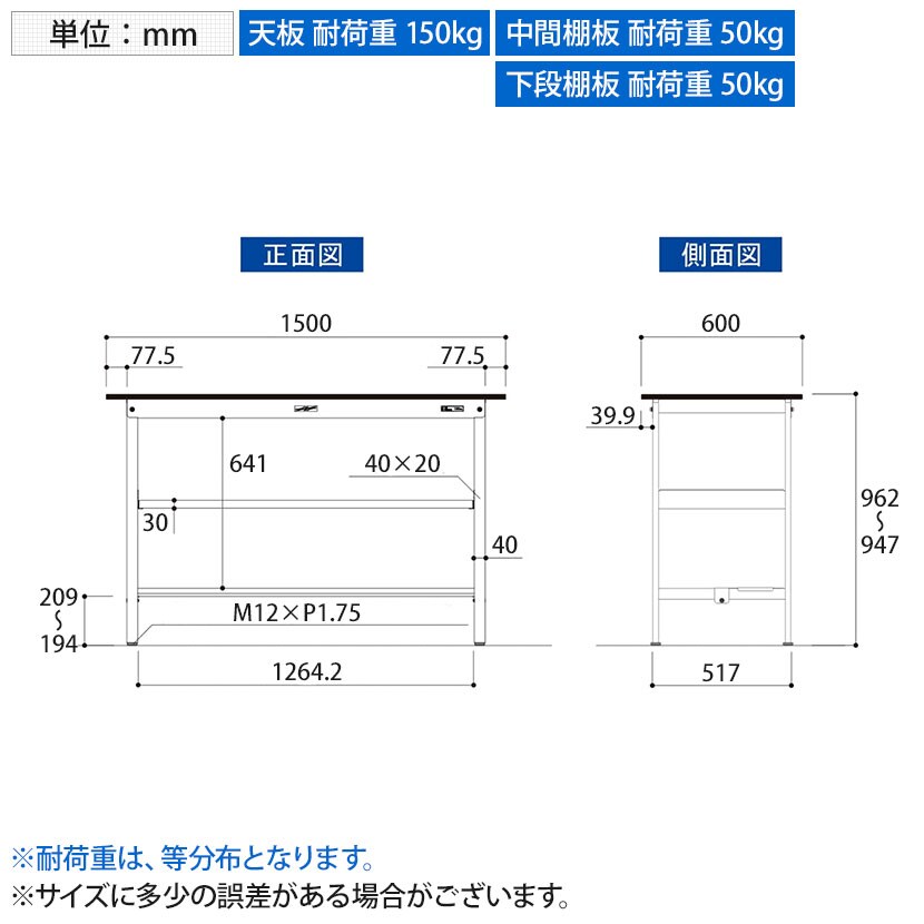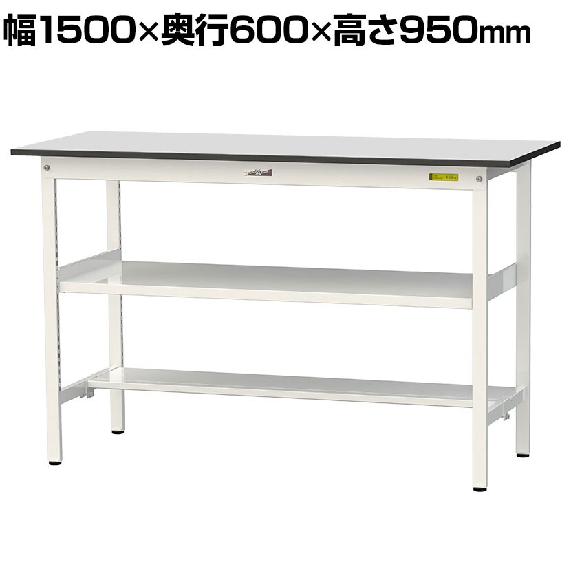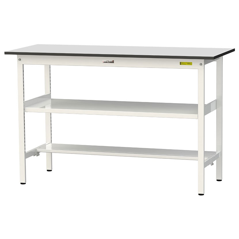 ・RoHS2指令対応の塩ビシート天板を採用。軽作業におすすめの汎用作業台、取り付け高さを変更できる中間棚板と足元に半面棚板付き。