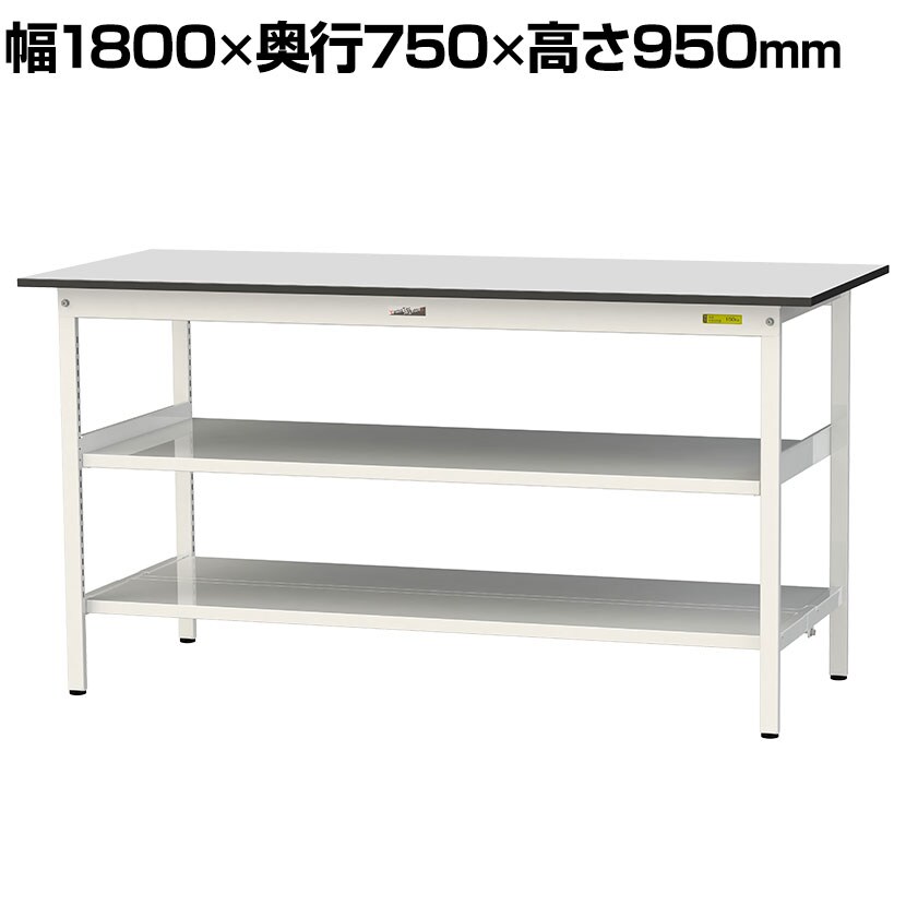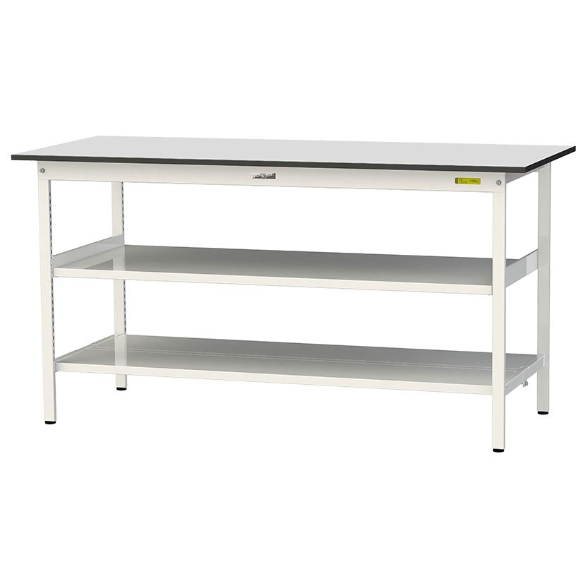 ・RoHS2指令対応の塩ビシート天板を採用。軽作業におすすめの汎用作業台、取り付け高さを変更できる中間棚板と足元に全面棚板付き。