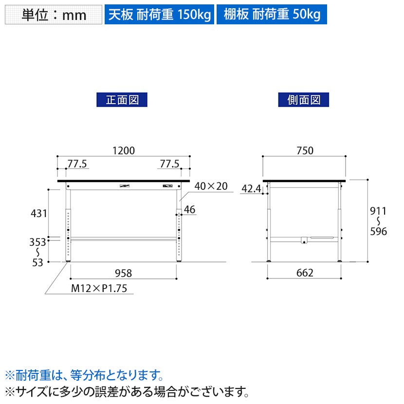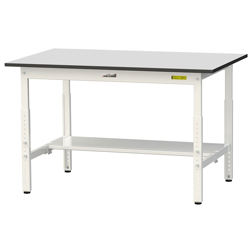 ・RoHS2指令対応の塩ビシート天板を採用。軽作業におすすめの高さ調整式の汎用作業台、足元に半面棚板付きです。