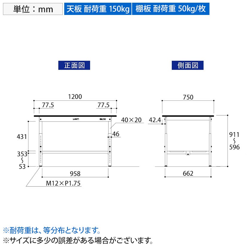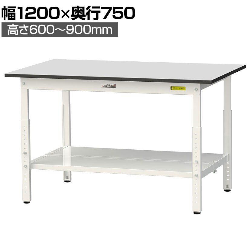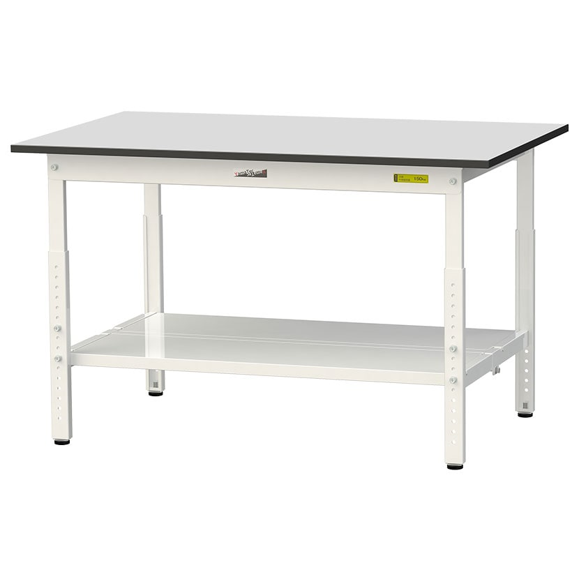 ・RoHS2指令対応の塩ビシート天板を採用。軽作業におすすめの高さ調整式の汎用作業台、足元に全面棚板付きです。