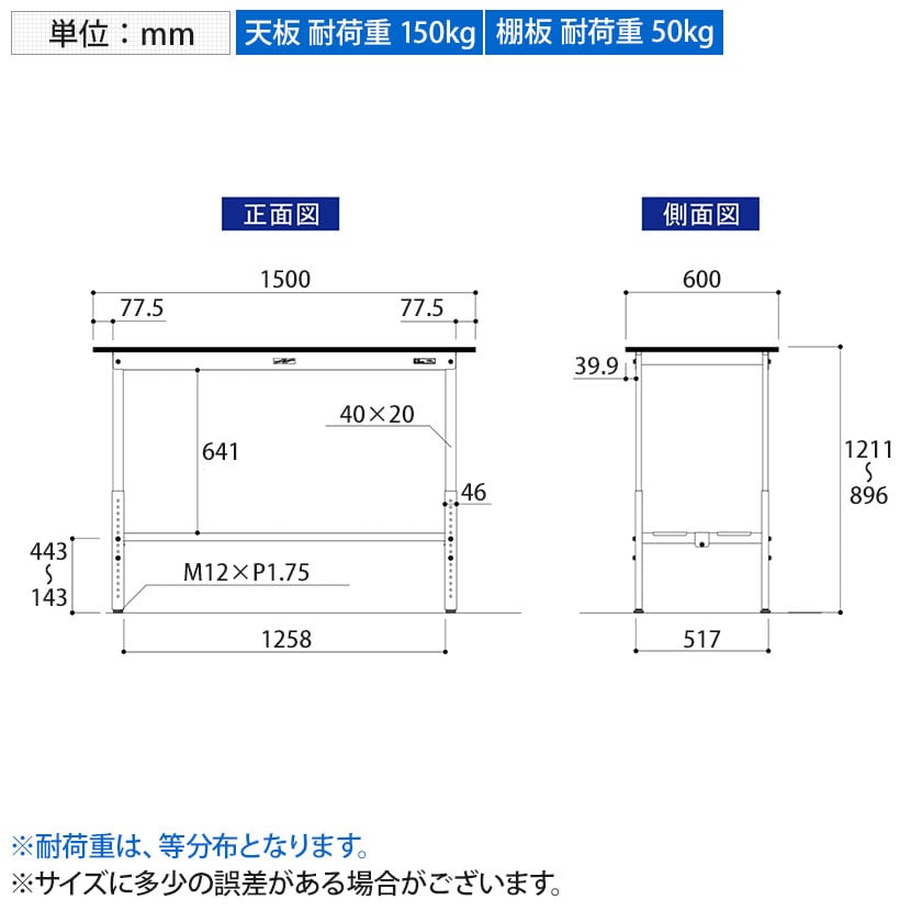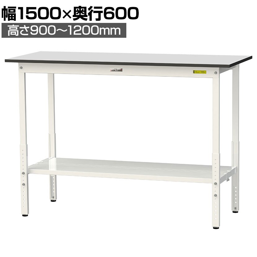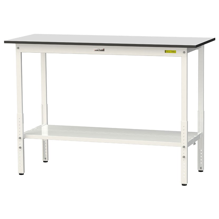 ・RoHS2指令対応の塩ビシート天板を採用。軽作業におすすめの高さ調整式の汎用作業台、足元に全面棚板付きです。