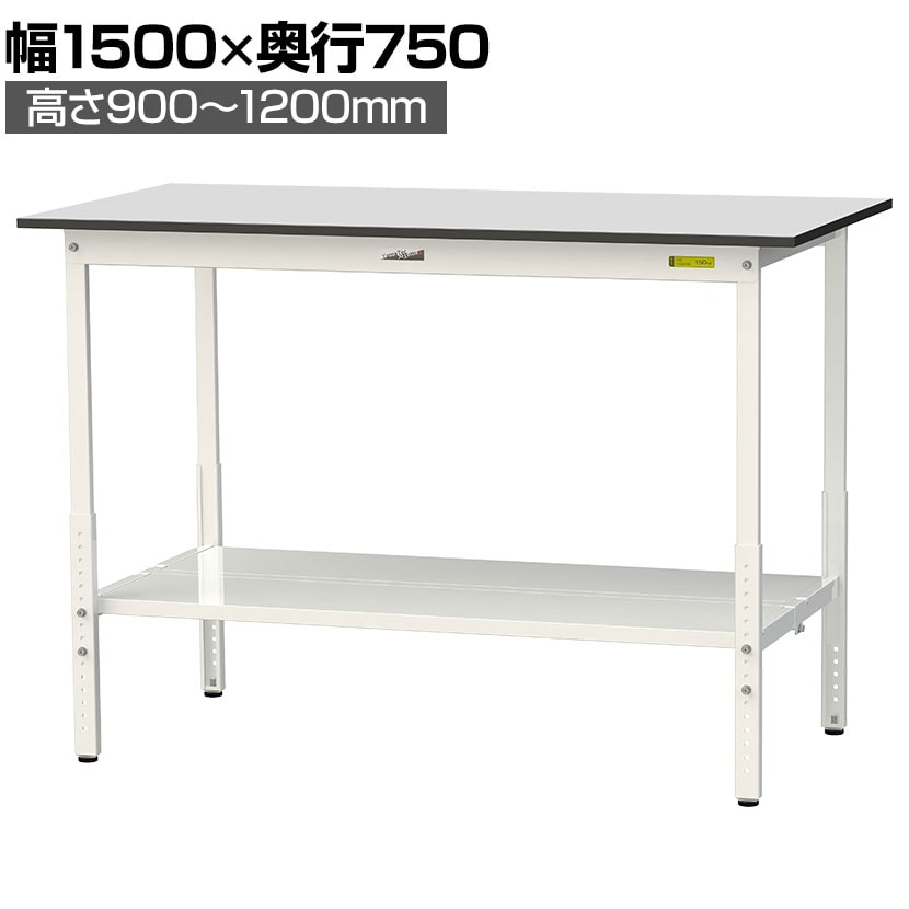 ・RoHS2指令対応の塩ビシート天板を採用。軽作業におすすめの高さ調整式の汎用作業台、足元に全面棚板付きです。