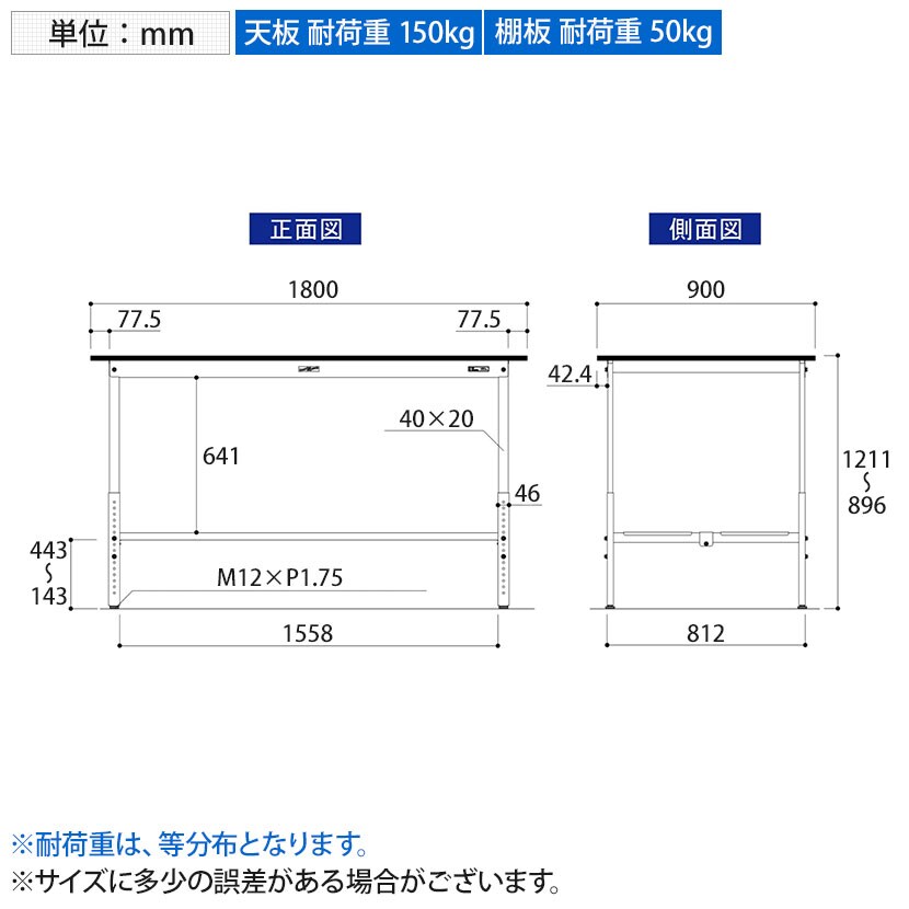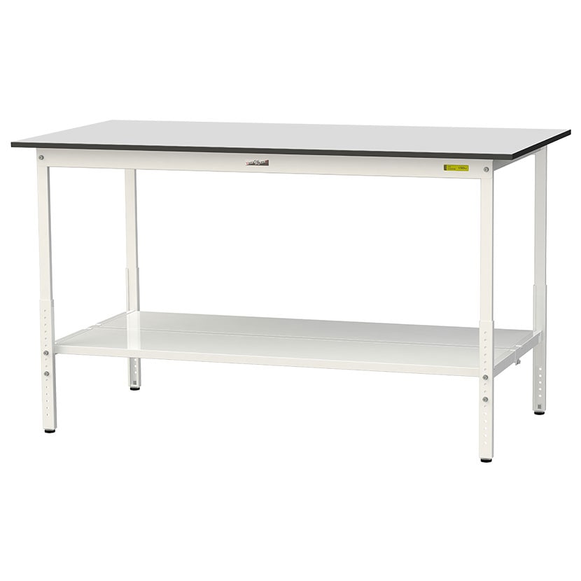 ・RoHS2指令対応の塩ビシート天板を採用。軽作業におすすめの高さ調整式の汎用作業台、足元に全面棚板付きです。