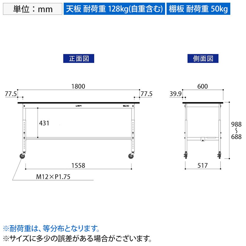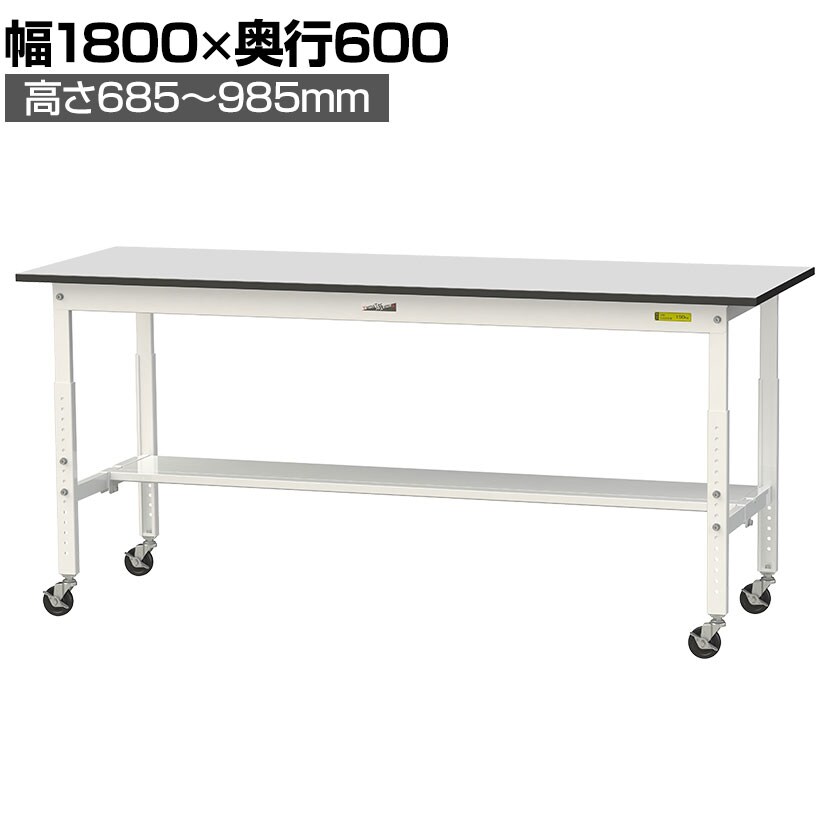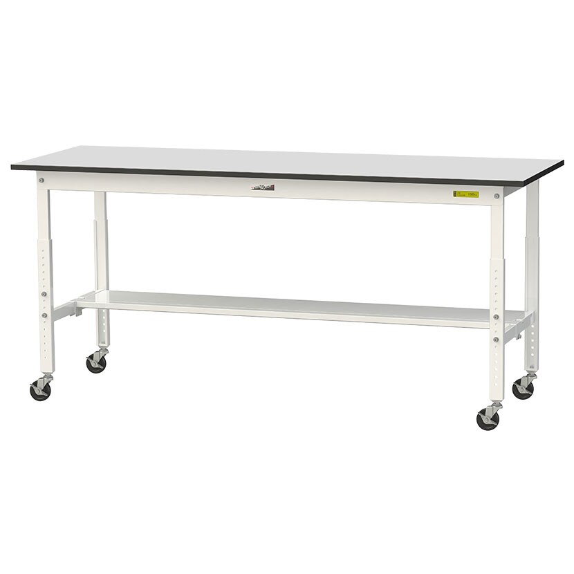 ・RoHS2指令対応の塩ビシート天板を採用。軽作業におすすめのキャスター付き&高さ調整式の汎用作業台。足元に半面棚板付きです。