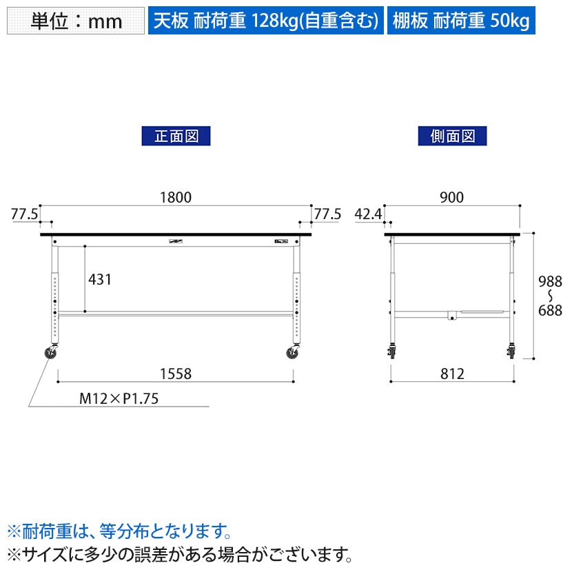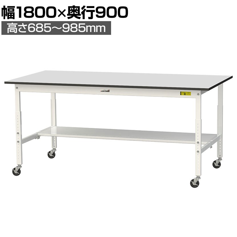 ・RoHS2指令対応の塩ビシート天板を採用。軽作業におすすめのキャスター付き&高さ調整式の汎用作業台。足元に半面棚板付きです。