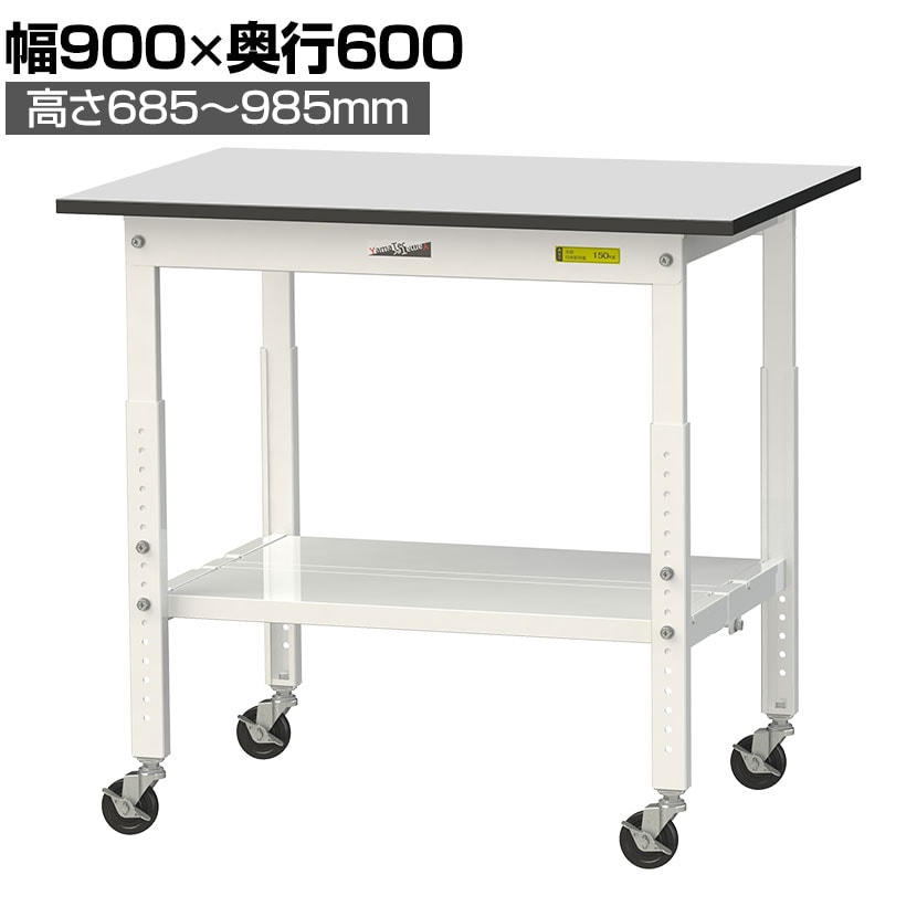 ・RoHS2指令対応の塩ビシート天板を採用。軽作業におすすめのキャスター付き&高さ調整式の汎用作業台。足元に全面棚板付きです。