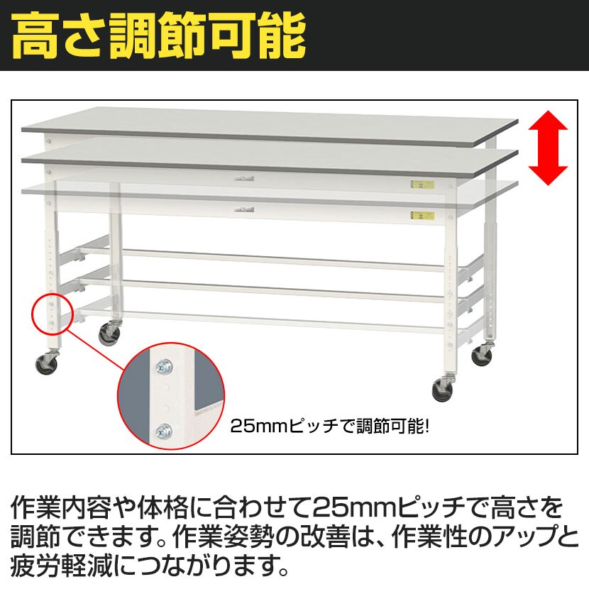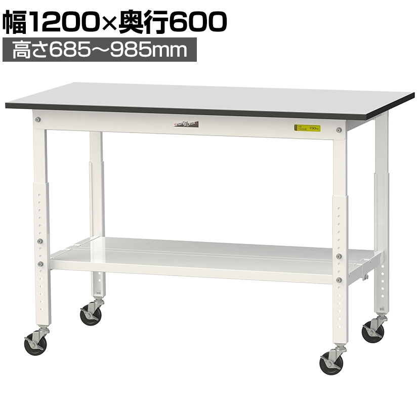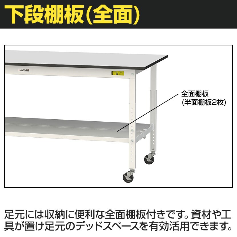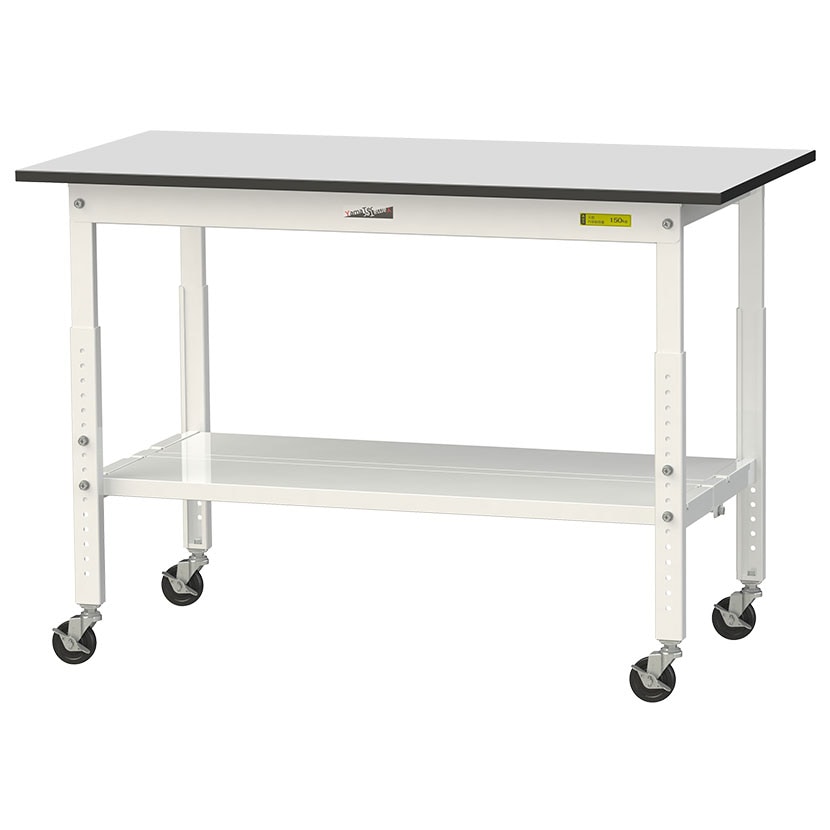 ・RoHS2指令対応の塩ビシート天板を採用。軽作業におすすめのキャスター付き&高さ調整式の汎用作業台。足元に全面棚板付きです。