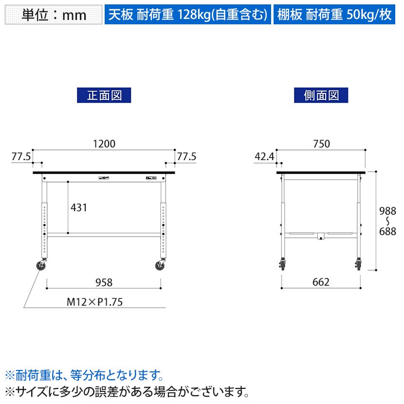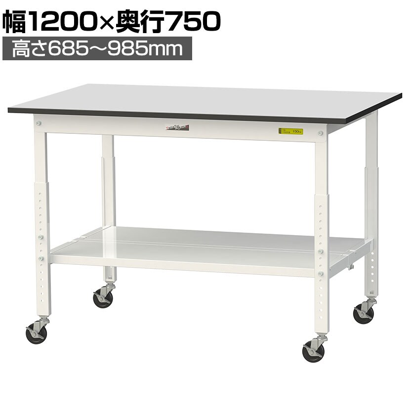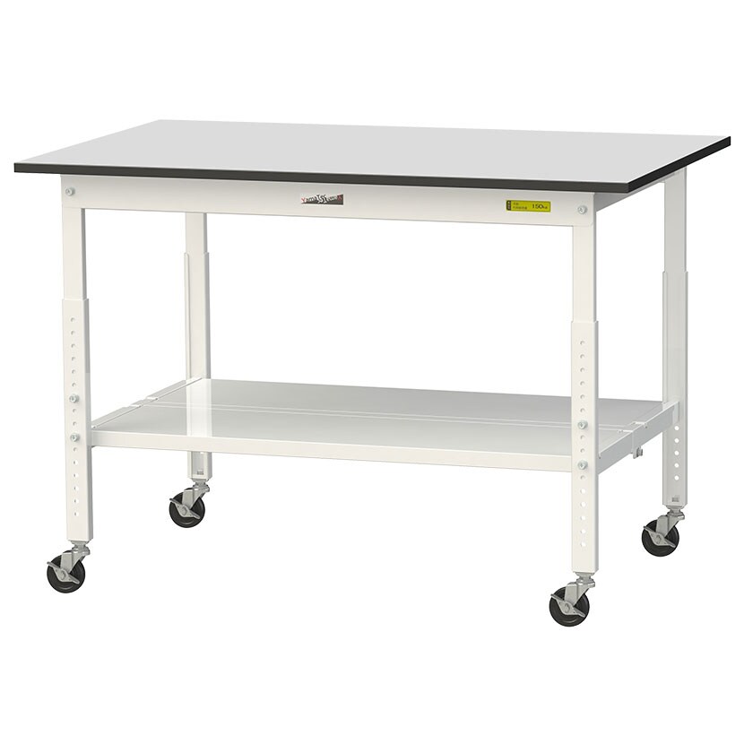 ・RoHS2指令対応の塩ビシート天板を採用。軽作業におすすめのキャスター付き&高さ調整式の汎用作業台。足元に全面棚板付きです。