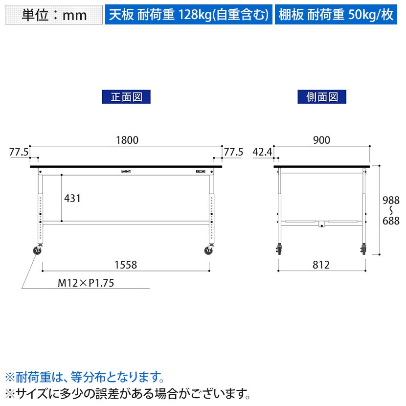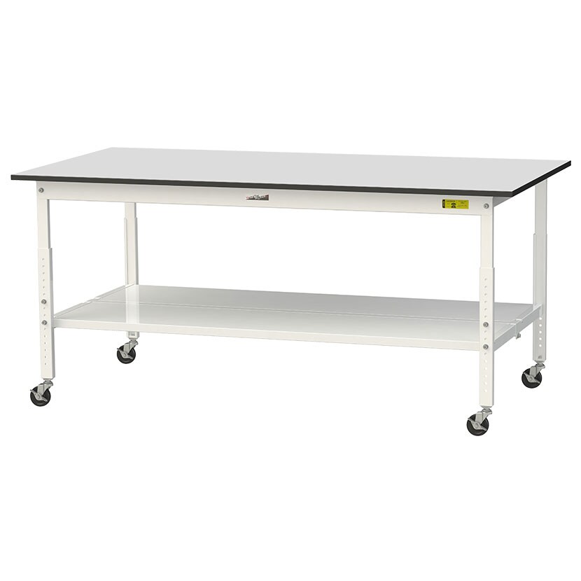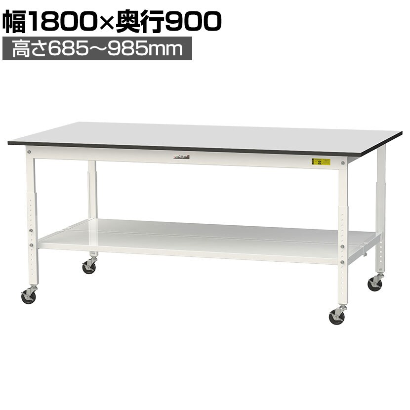 ・RoHS2指令対応の塩ビシート天板を採用。軽作業におすすめのキャスター付き&高さ調整式の汎用作業台。足元に全面棚板付きです。