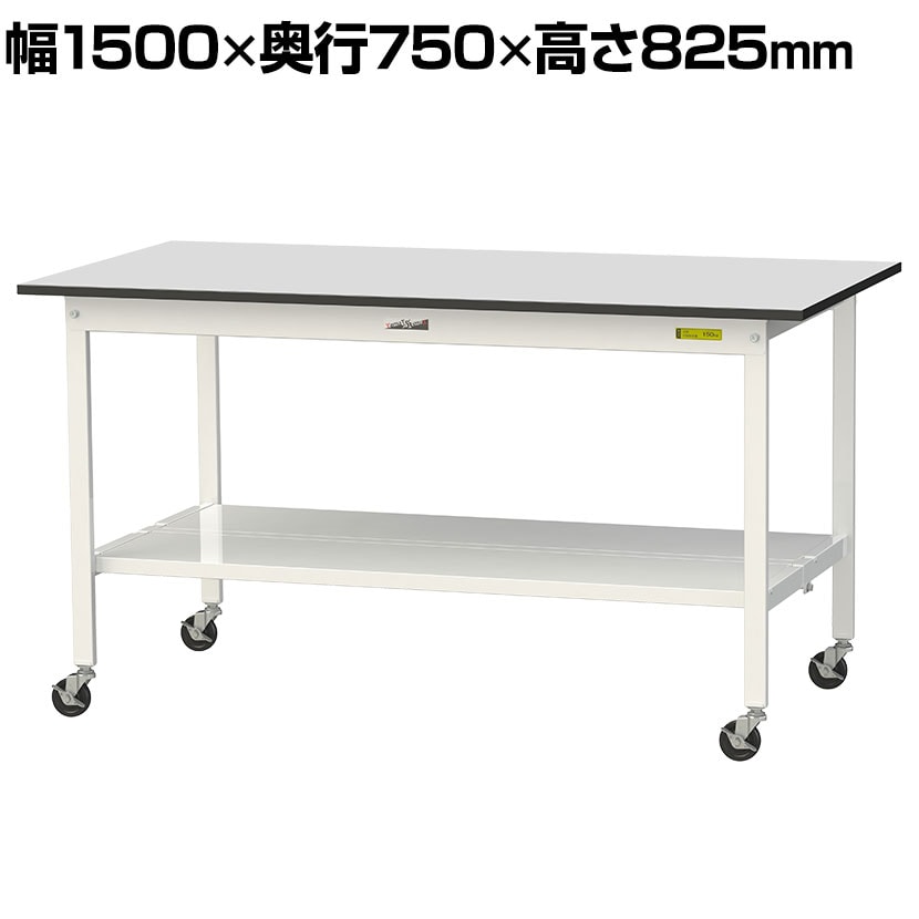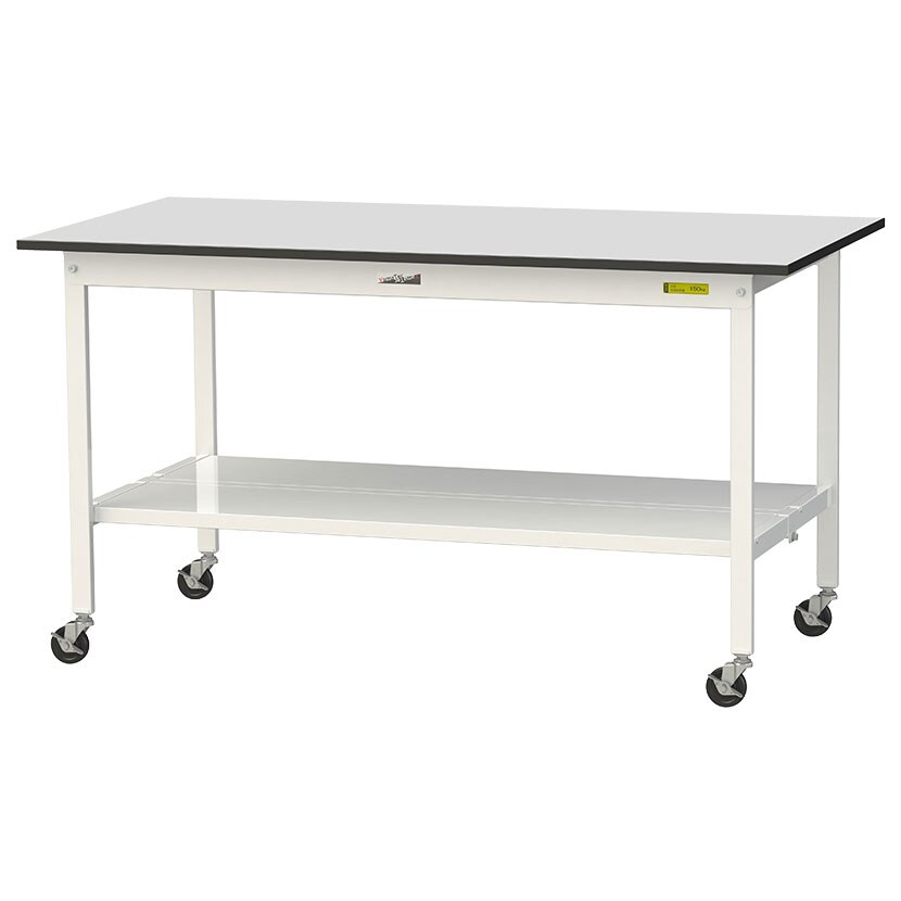 ・RoHS2指令対応の塩ビシート天板を採用。軽作業におすすめのキャスター付き汎用作業台です。足元に全面棚板付き。