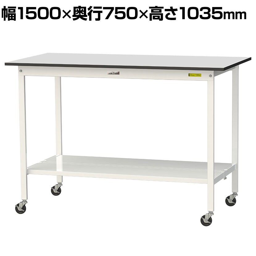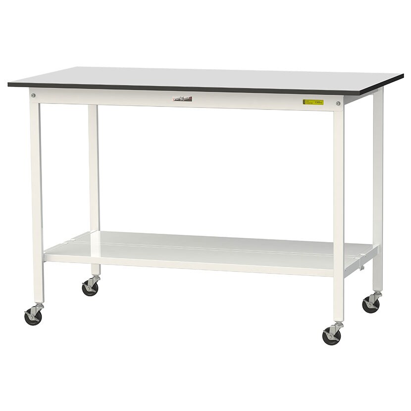 ・RoHS2指令対応の塩ビシート天板を採用。軽作業におすすめのキャスター付き汎用作業台です。足元に全面棚板付き。