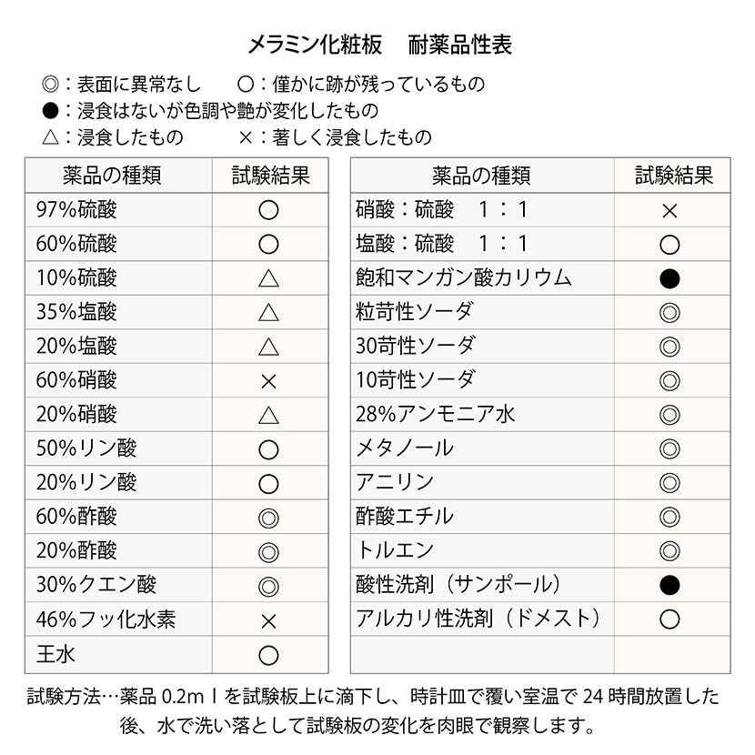 ・表面材のメラミン化粧板は、耐久性・耐水性・耐汚染性・耐薬品性に優れます。