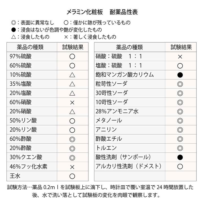・表面材のメラミン化粧板は、耐久性・耐水性・耐汚染性・耐薬品性に優れます。
