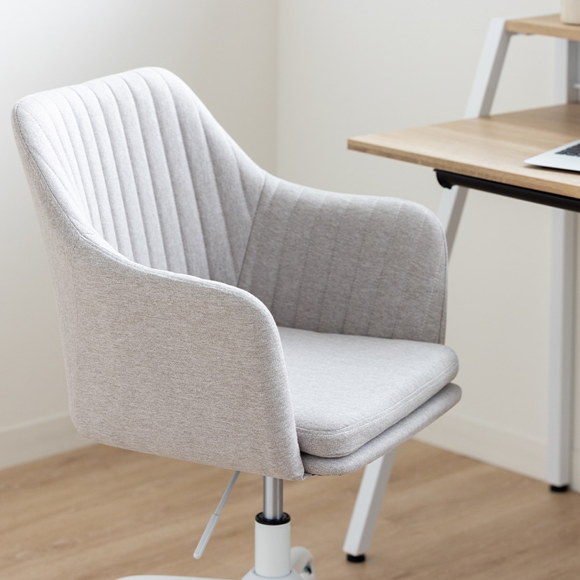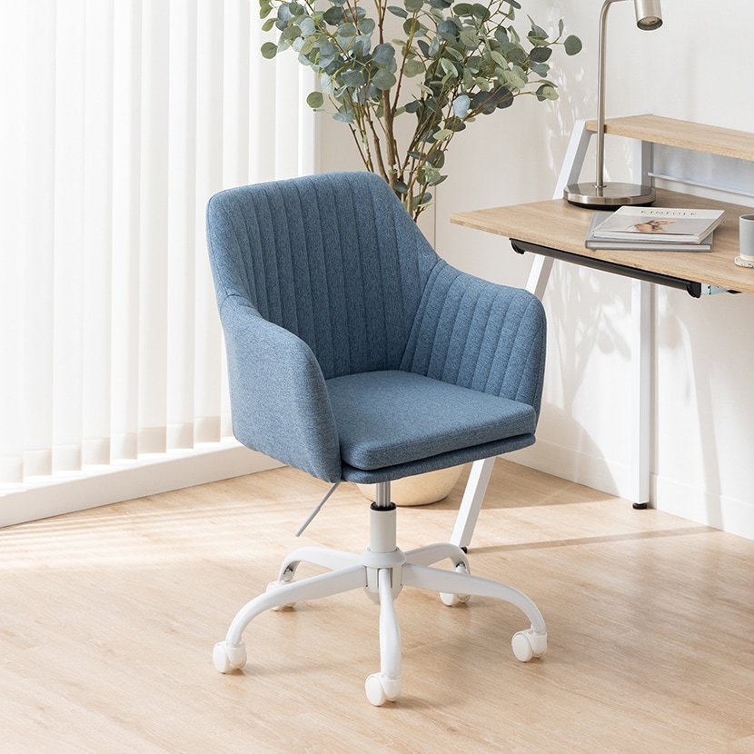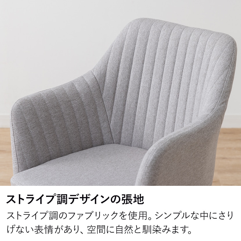 ストライプ調のファブリックに、肘掛けや昇降・回転機能を備えた、使い勝手のよいデスクチェアです。