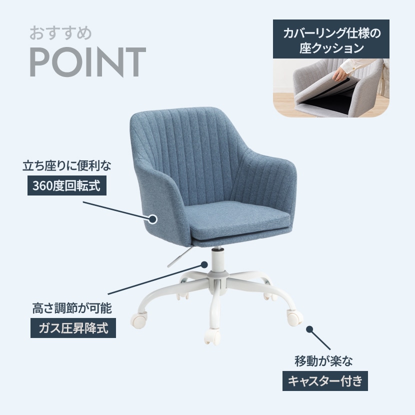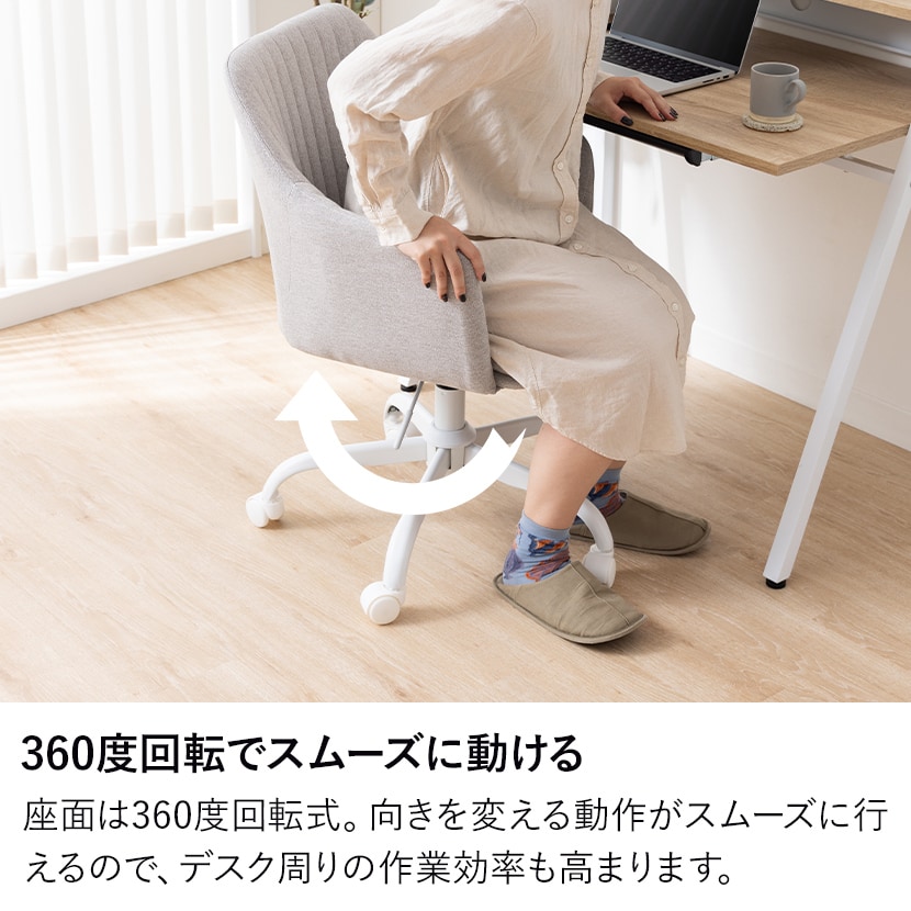 座面は360度回転式。向きを変える動作がスムーズに行えるので、デスク周りの作業効率も高まります。