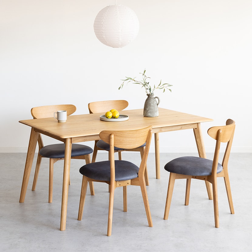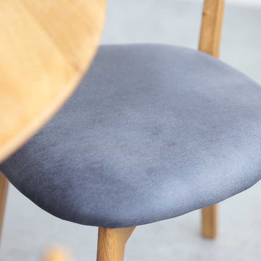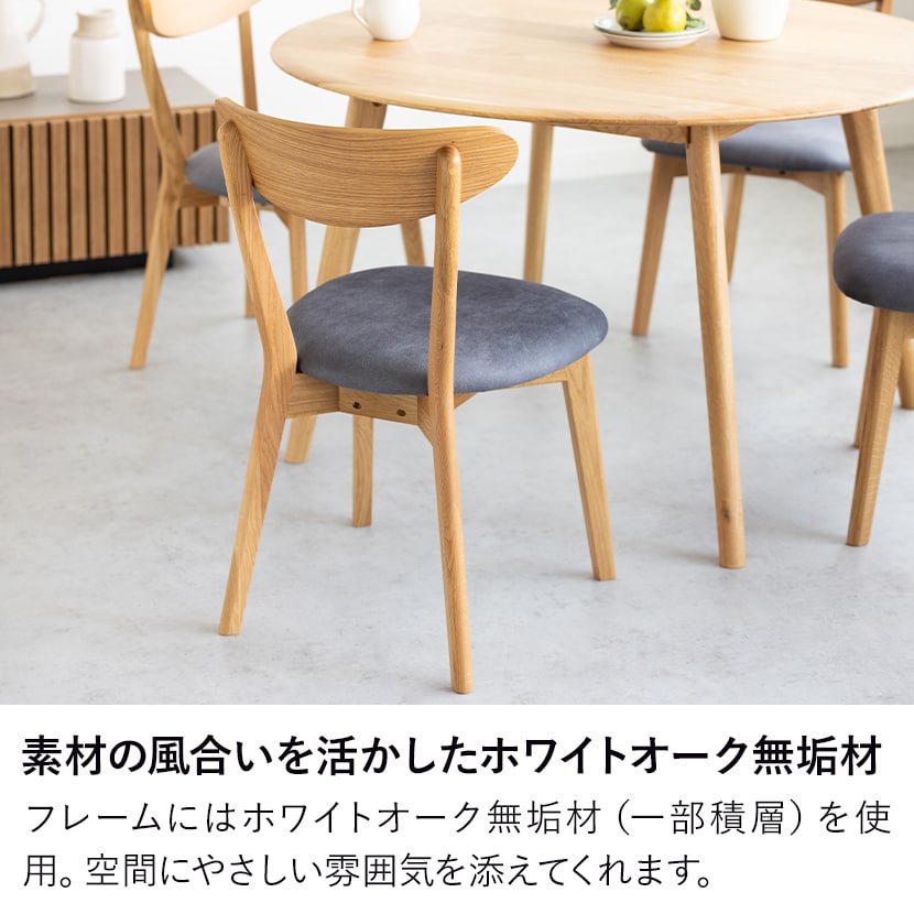 ホワイトオークの美しい木肌に、撥水性のあるレザーファブリックを組み合わせたダイニングチェアです。