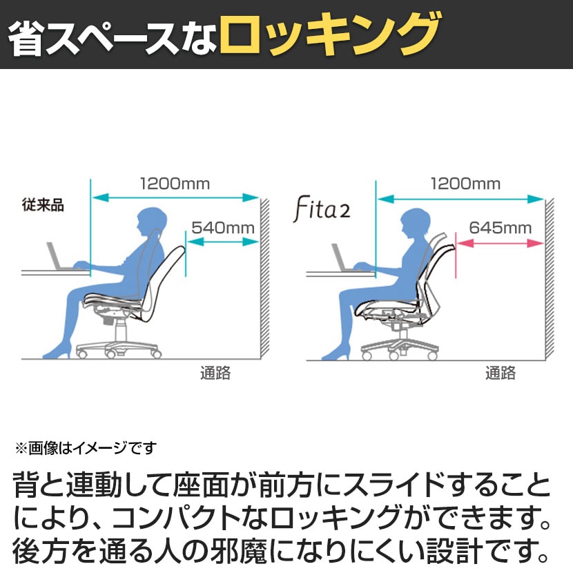 背と連動してシートが前方にスライドすることによりコンパクトなロッキングが可能。