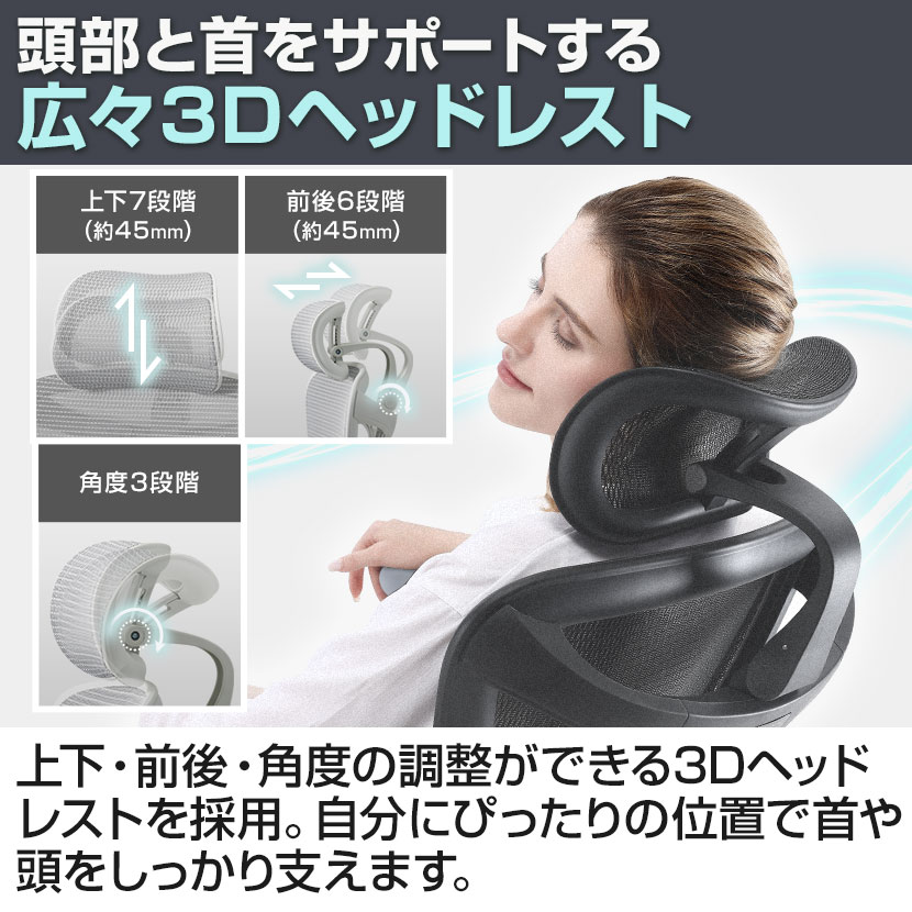 ・3Dヘッドレスト(上下、前後、角度調節可能)