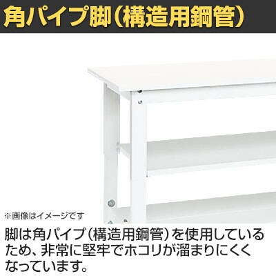 ・抗菌、抗ウイルス効果のあるパステル色の天板を使用した作業台です。本体は銀イオン配合による抗菌効果のある粉体塗装を使用しています。