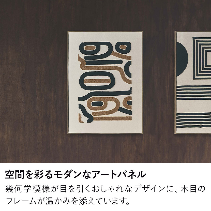 幾何学模様が目を引くおしゃれなデザインに、木目のフレームが温かみを添えています。