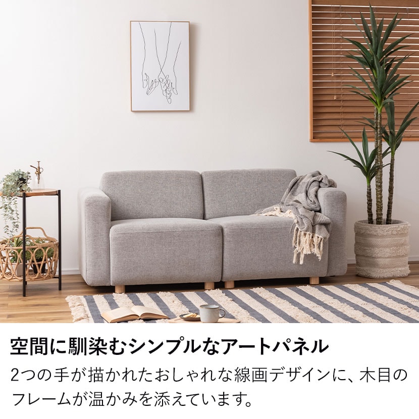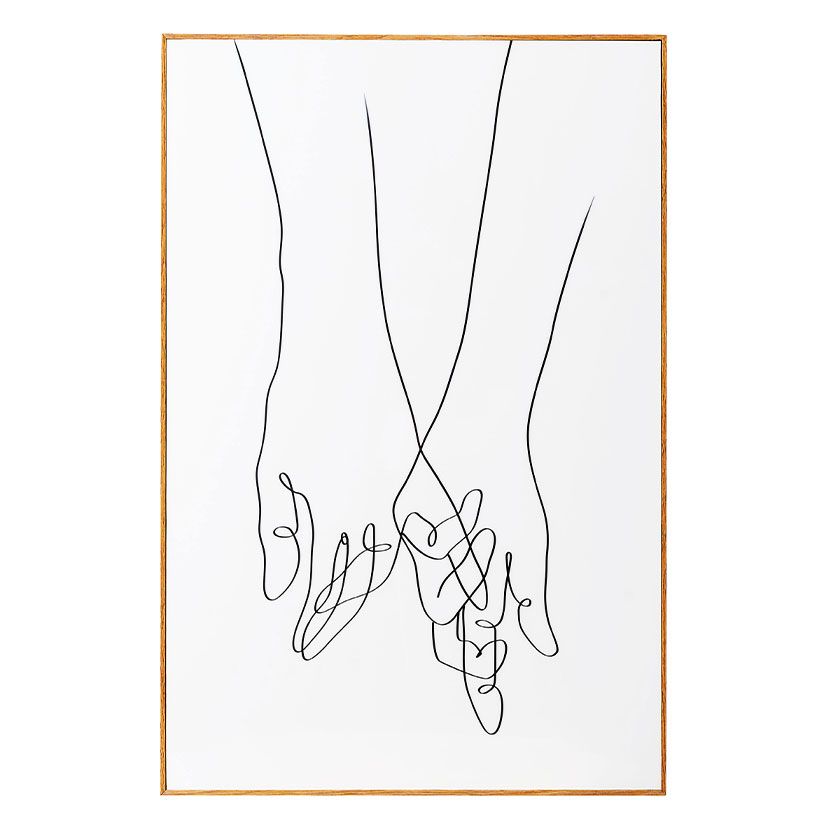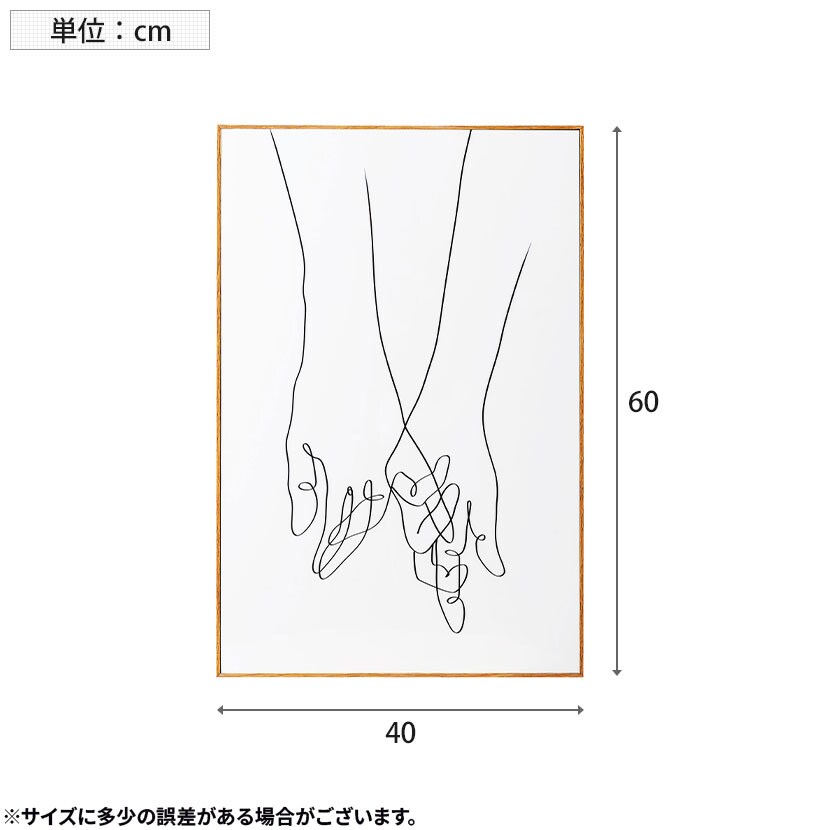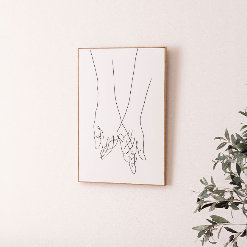 2つの手が描かれたおしゃれな線画デザインに、木目のフレームが温かみを添えています。