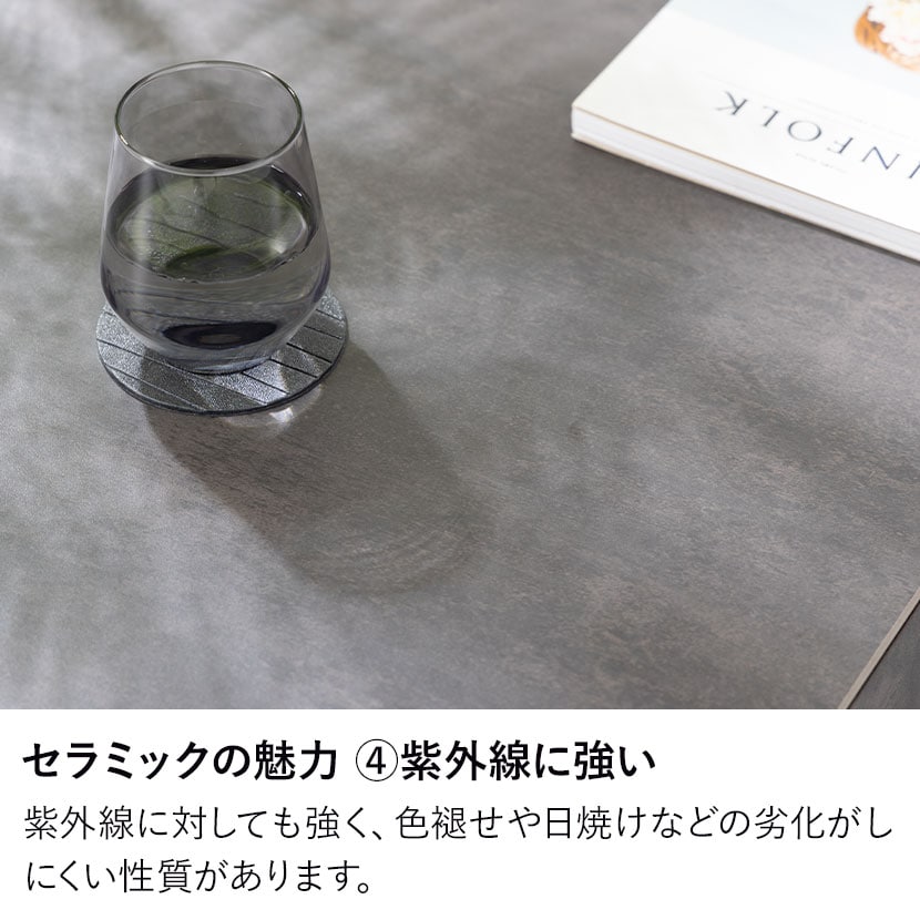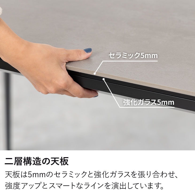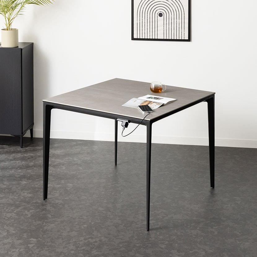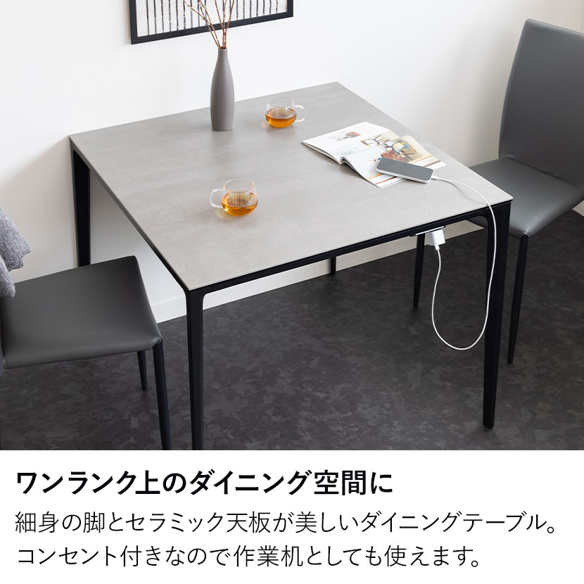モダンで高級感あふれるセラミック天板と、機能性を高めるコンセントを備えたダイニングテーブル。熱や傷に強く、お手入れも簡単なテーブルは、日々の食事からワークスペースまで幅広いシーンで活躍します。