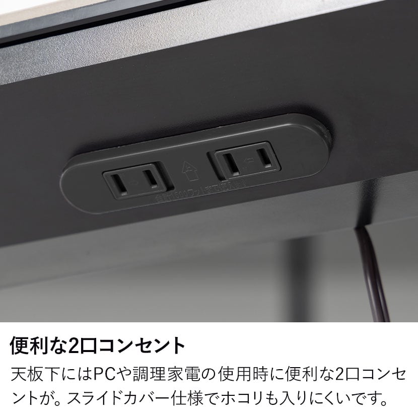 天板下にはPCや調理家電の使用時に便利な2口コンセントを備えています。スライドカバー仕様でホコリが入りにくいです。