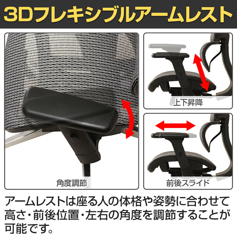 3Dフレキシブルアームレスト(高さ・前後・角度調節可能)