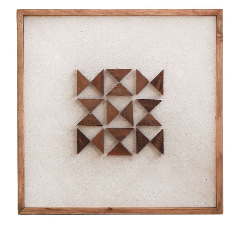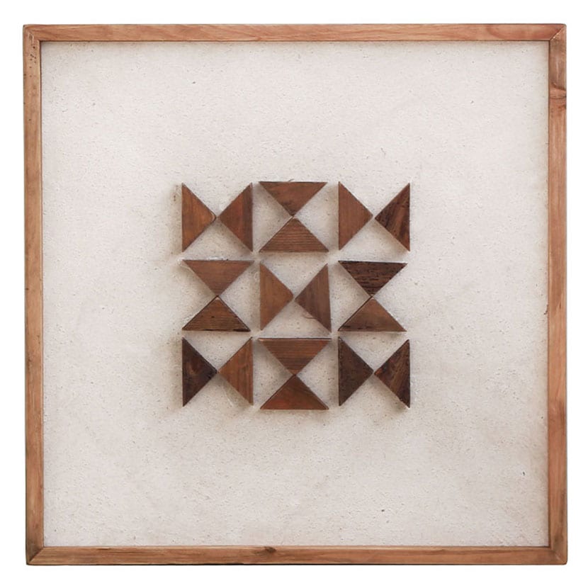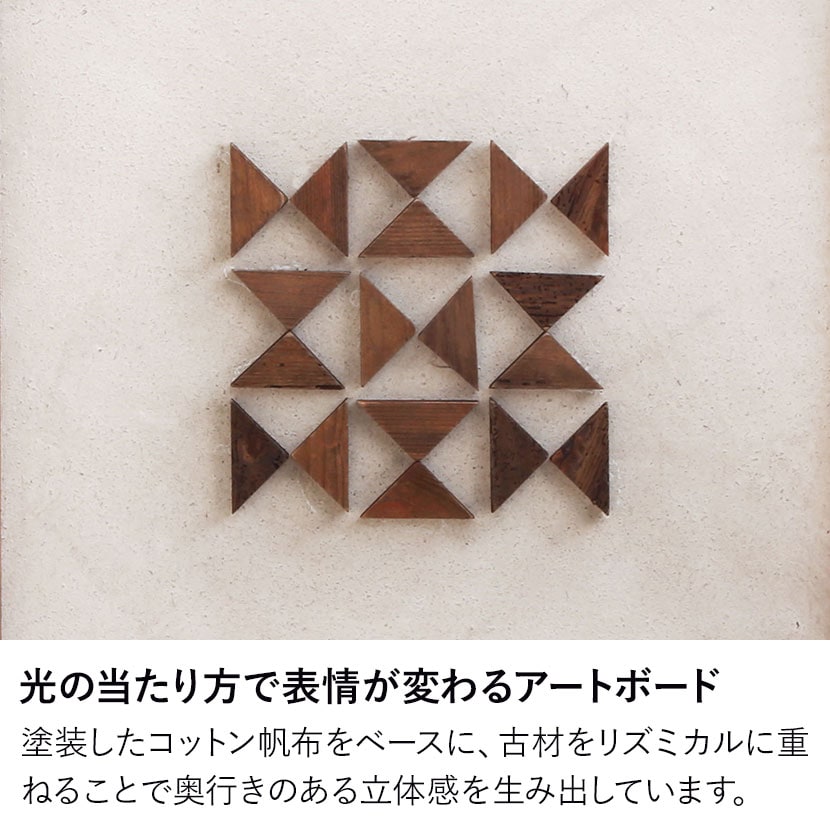 塗装したコットン帆布をベースに、古材をリズミカルに重ねることで奥行きのある立体感を生み出しています。