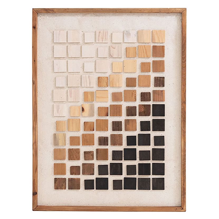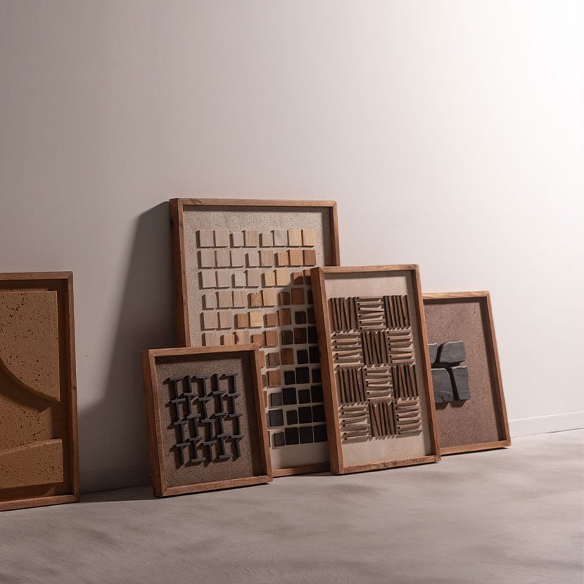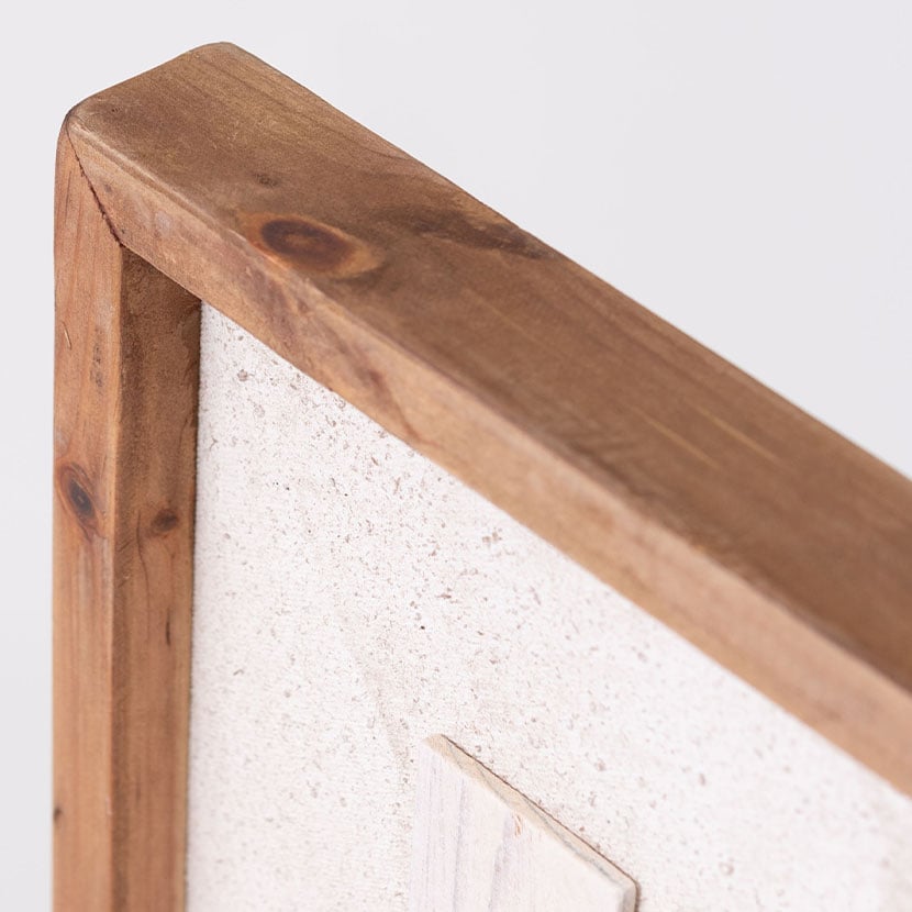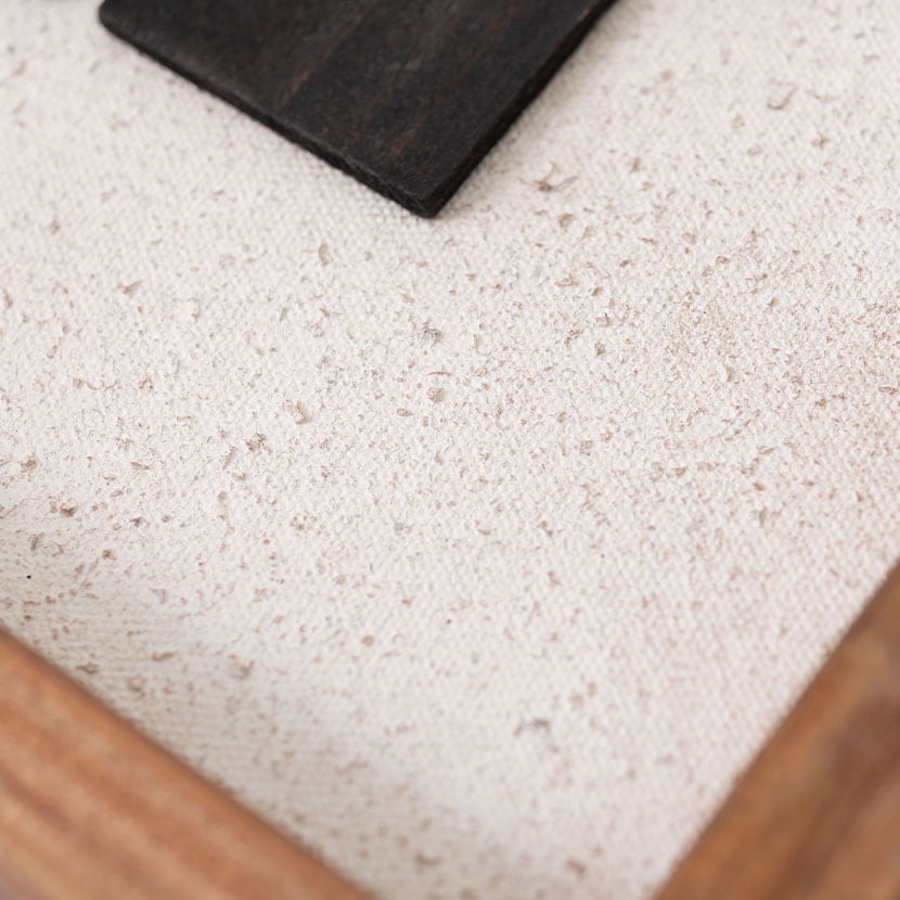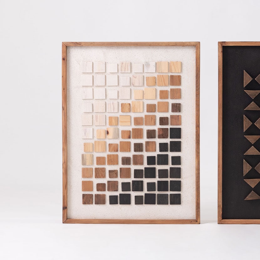 塗装したコットン帆布をベースに、古材をリズミカルに重ねることで奥行きのある立体感を生み出しています。