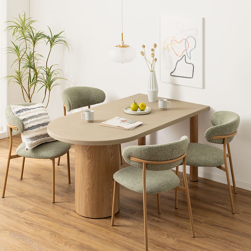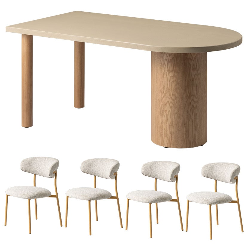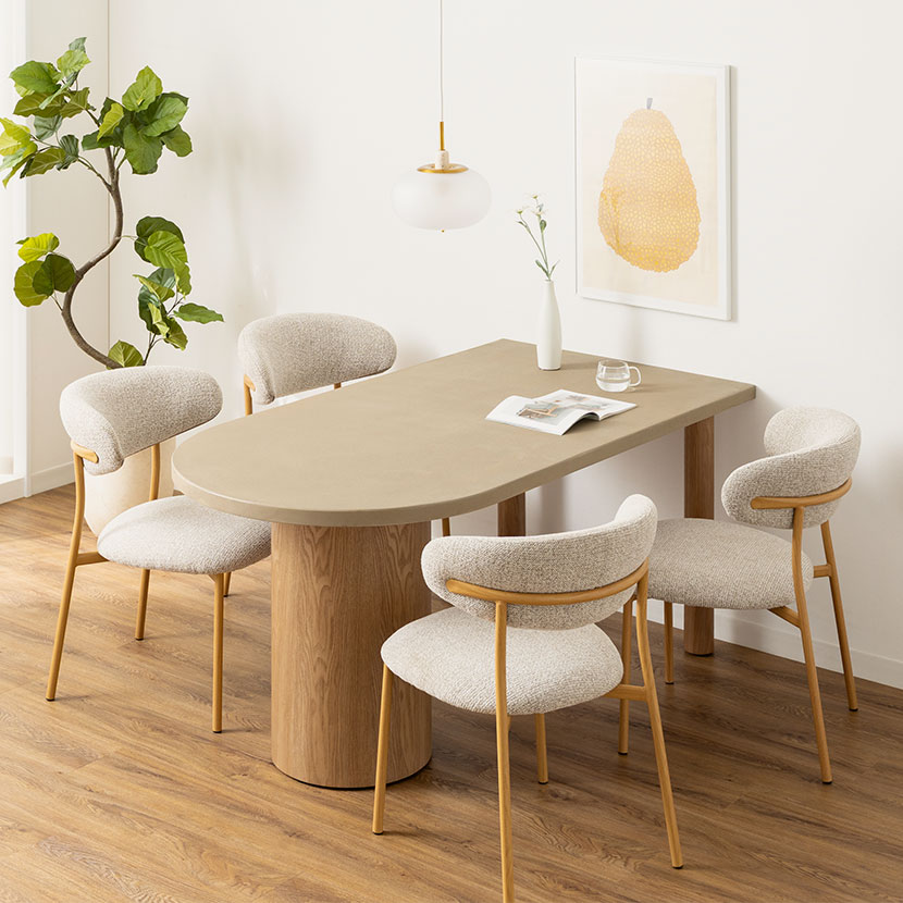 重厚感のあるモルタル天板と、あたたかみのある木脚を組み合わせた、異素材のダイニングテーブルです。