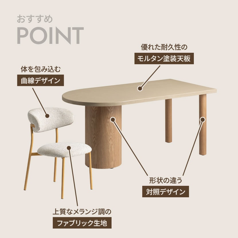 丸みのあるかわいらしいフォルムと使いやすいファブリック生地が魅力のダイニングチェアです。