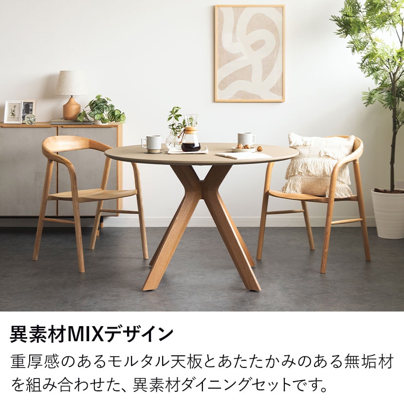 重厚感のあるモルタル天板と、あたたかみのある無垢材を組み合わせた、異素材のダイニングセットです。