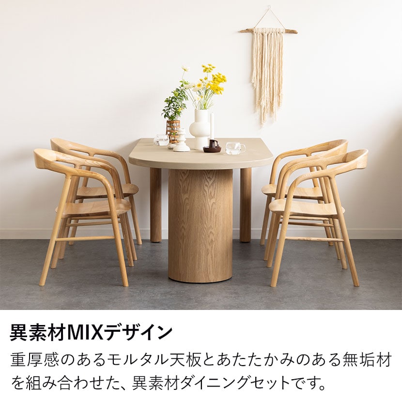 重厚感のあるモルタル天板と、あたたかみのある無垢材を組み合わせた、異素材のダイニングセットです。