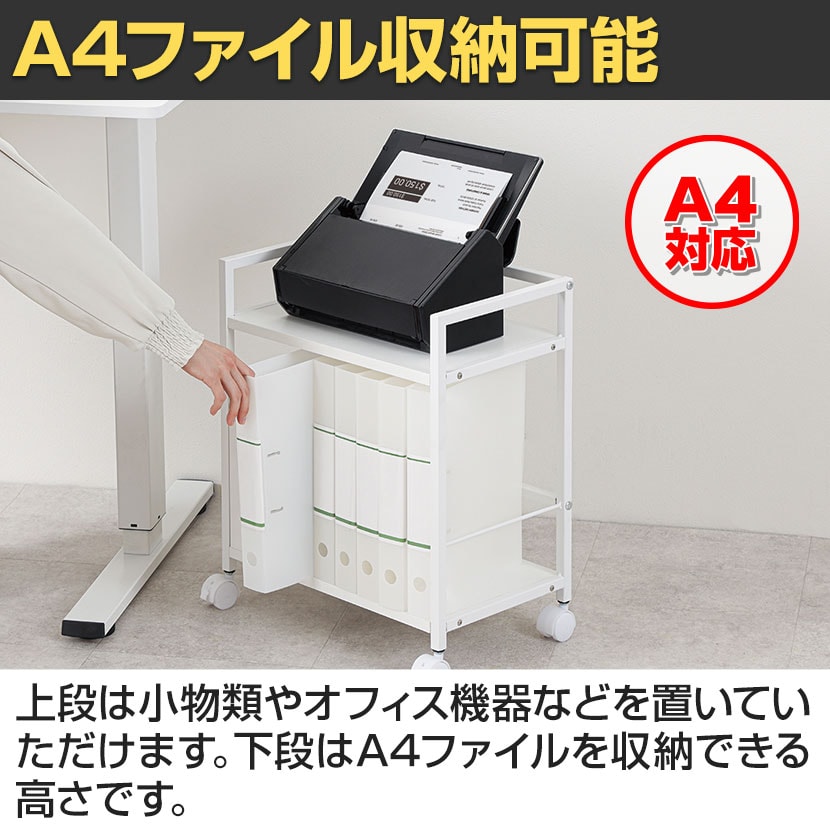 座ったまま下段のファイルを取り出し可能で上段にはオフィス機器などを収納できます。