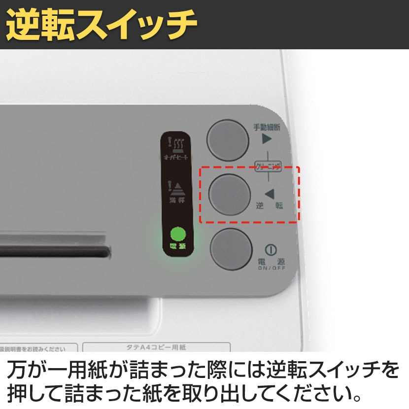 万が一用紙が詰まった際には逆転スイッチを押して詰まった紙を取り出してください。