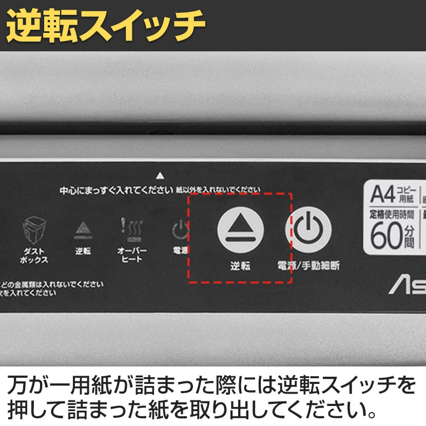 万が一用紙が詰まった際には逆転スイッチを押して詰まった紙を取り出してください。