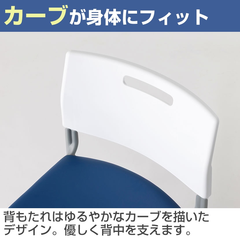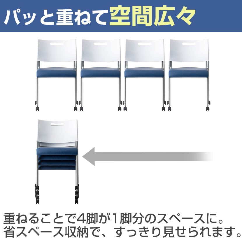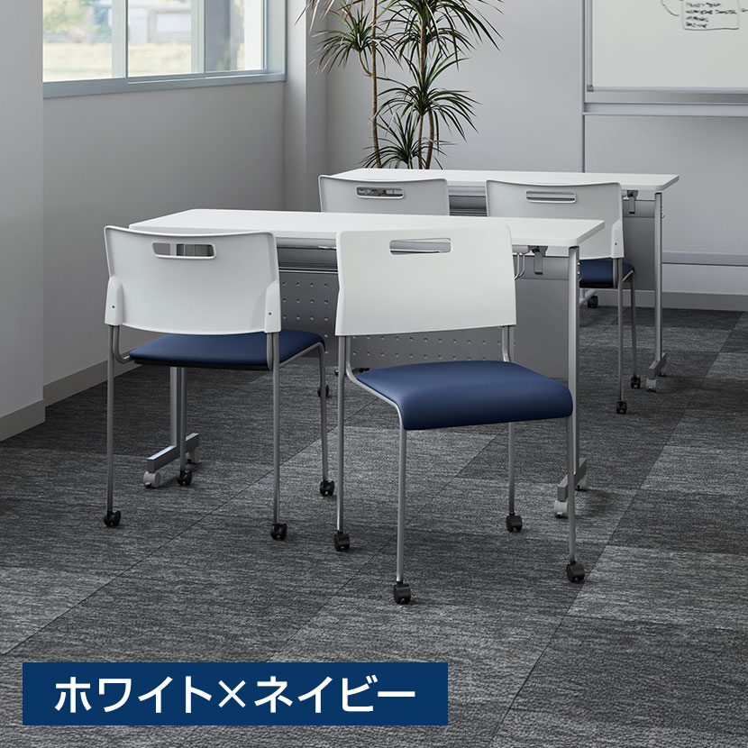 会議スペースや休憩スペース、セミナー、研修など、様々な場面で活躍するミーティングチェアです。移動に便利なキャスター付きで、レイアウト変更もスムーズに行えます。4脚までスタッキングできるので、コンパクトに収納可能。座面には、柔らかな座り心地のPUレザーを使用しており、背には移動や重ねるときに便利な取っ手付き。カラーは全8色で、ホワイトとブラックの2色をベースに、座面は発色のよい4色をご用意しました。オフィスの雰囲気に合わせてお選びください。
