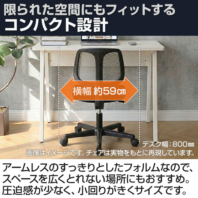 アームレスのすっきりとしたフォルムなので、スペースを広くとれない場所にもおすすめ。圧迫感が少なく、小回りがきくサイズです。