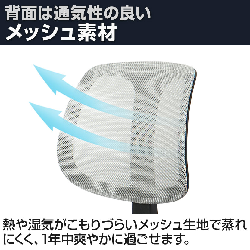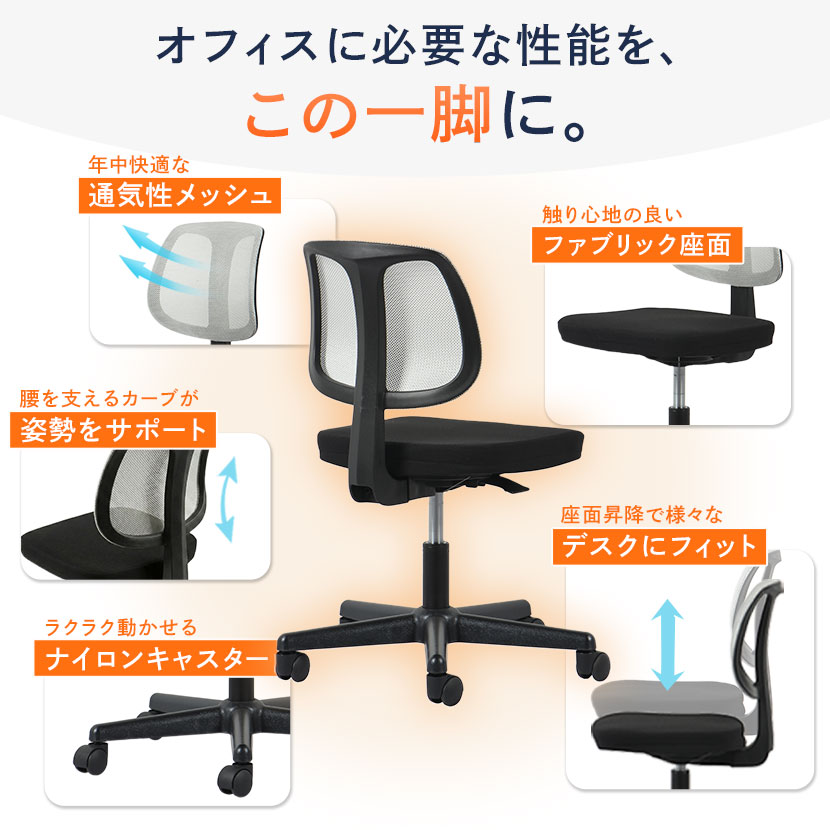 腰に沿ったカーブの背もたれと通気性の良いメッシュバックで、長時間の作業でも快適に過ごせます。座面昇降機能付きでデスクや体格に合わせて作業がしやすい高さに調整できるため、様々な働き方にフィット。毎日のデスクワークをしっかりサポートし、コストパフォーマンスにも優れた頼れる一脚です。
