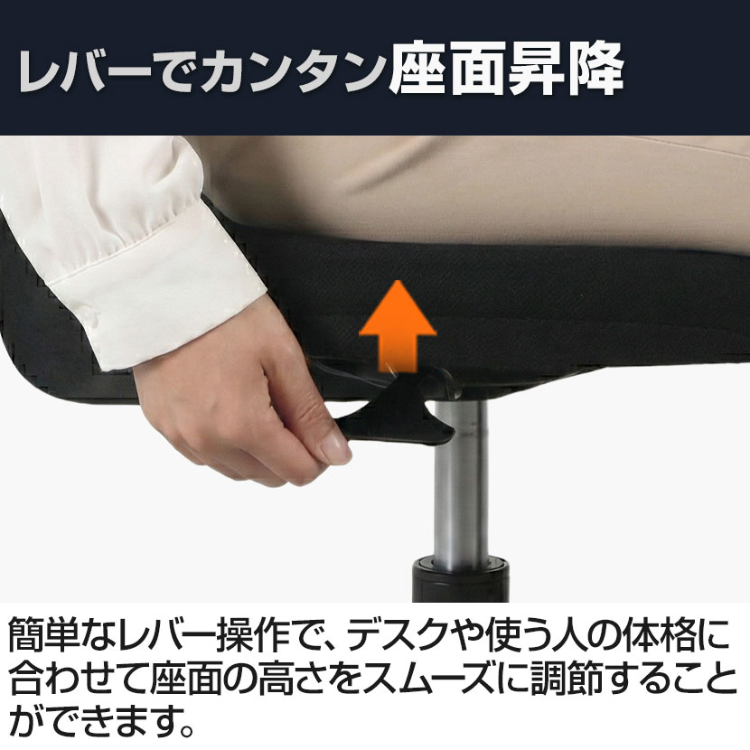 簡単なレバー操作で、デスクや使う人の体格に合わせて座面の高さをスムーズに調節することができます。