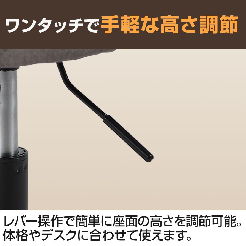 座面下のレバーで高さをスムーズに調節。体格やデスクに合わせた、お好みの高さ設定が可能です。
