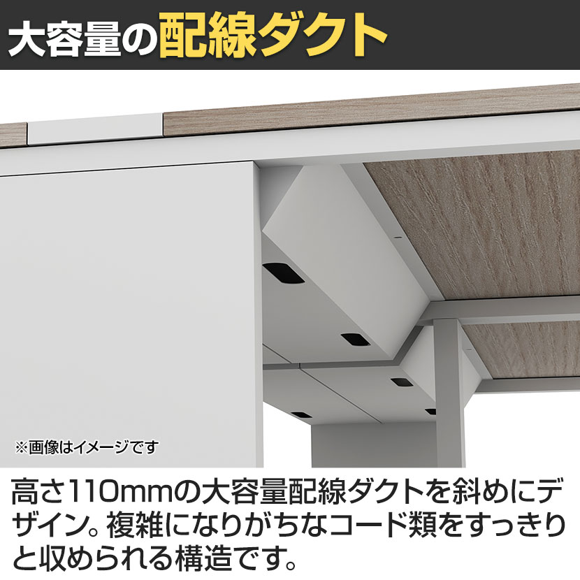 大容量の配線ダクトを装備し、クランプ式のモニターアーム等の取り付けも可能。