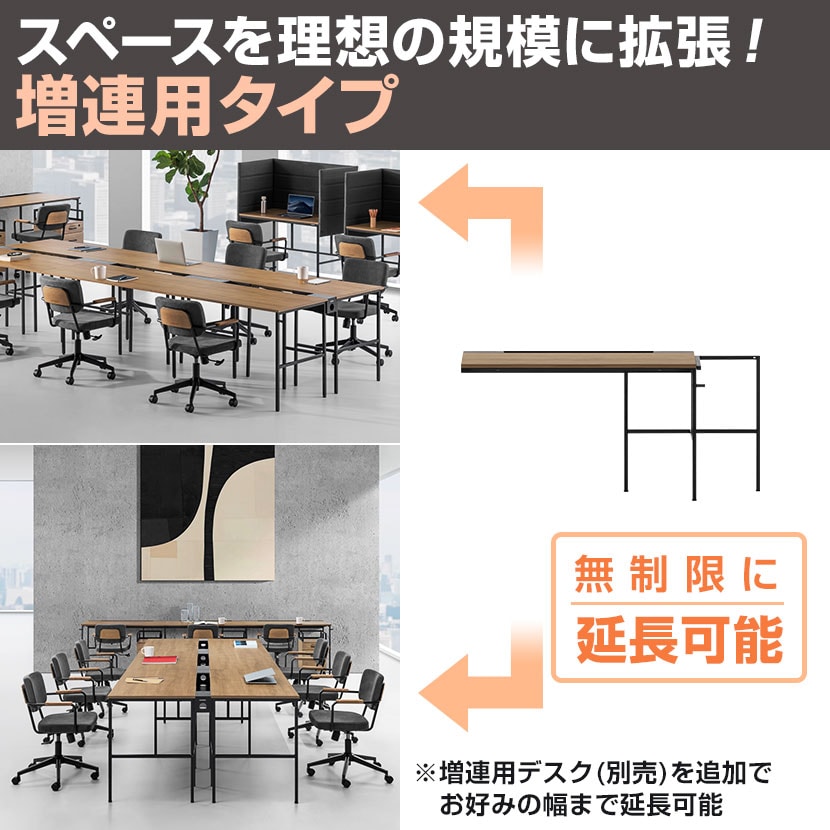 用途や人数に合わせて追加の連結が可能。必要台数を追加することで、従業員の増員に対応。また連結を外して台数を調節することにより、テレワークの導入で出社率に増減がある場合など、新しい働き方にも柔軟に対応できます。フリーアドレス以外に、ミーティングやコワーキングスペースでの使用など、オフィスに幅広く活用できるデスクです。