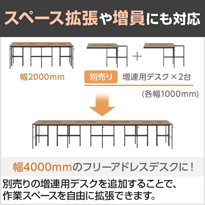 別売りの増連用デスクを追加することで、作業スペースを自由に拡張できます。後からの人員増加にもフレキシブルに対応。