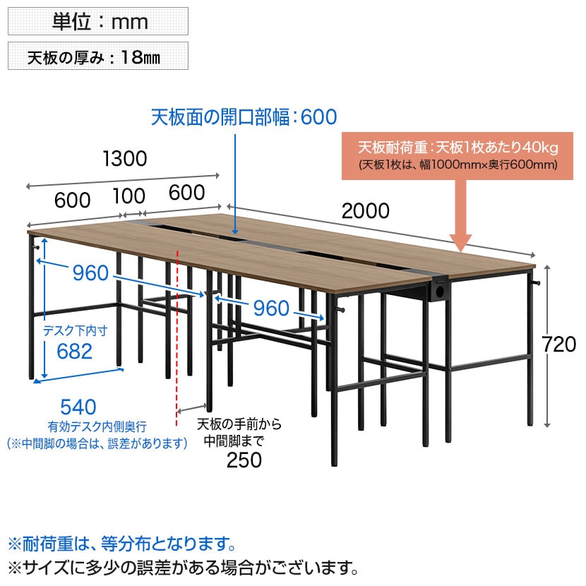 外寸奥行1300mmで向かいの人との距離をしっかり確保。天板の有効奥行は600mmあり、PCや資料を並べても余裕の広さです。